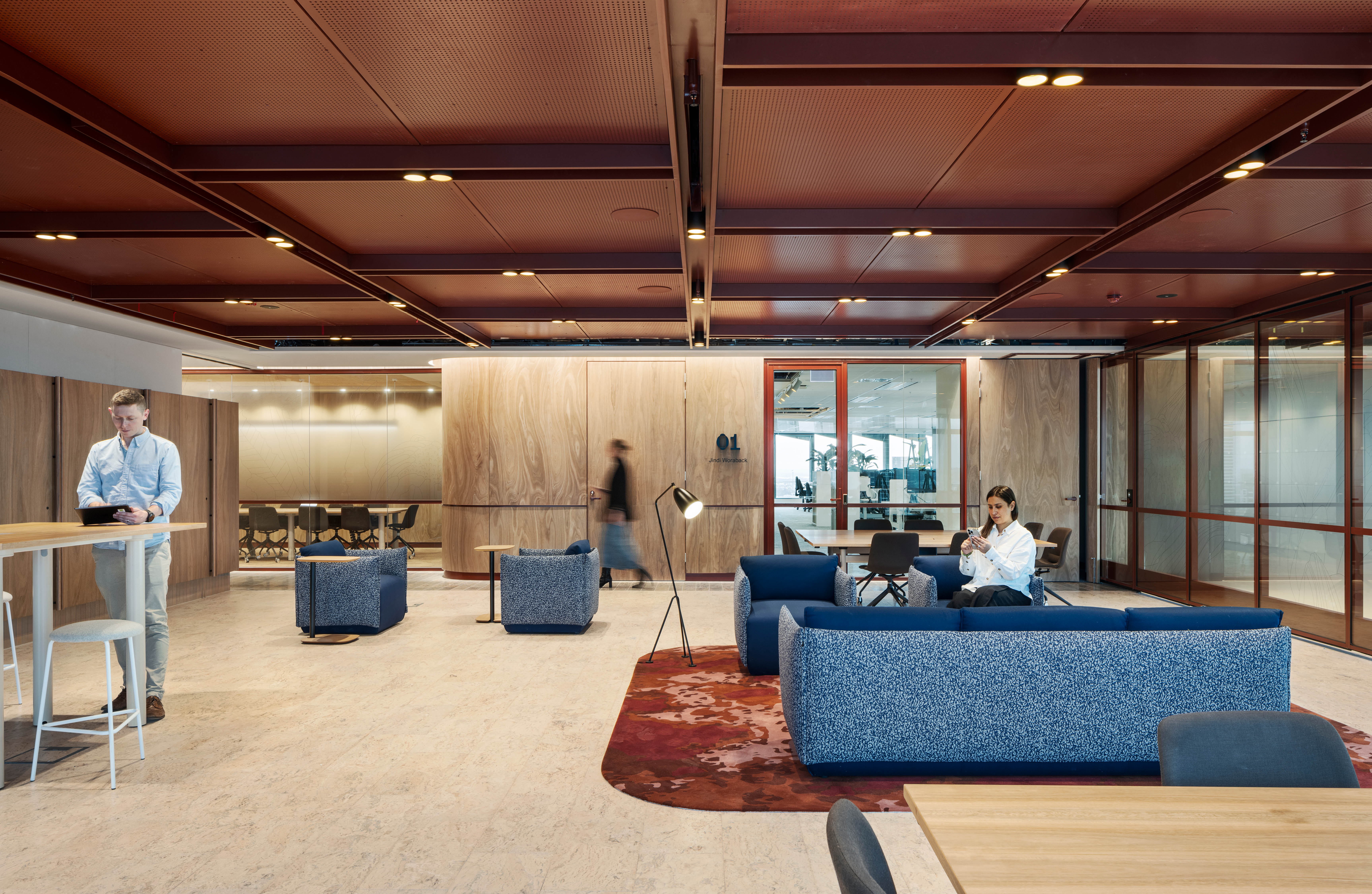 Our Melbourne team fitted out Levels 22 and 23 of Melbourne Quarter Tower for our client Beca. The office is a truly modern workspace with numerous collaboration opportunities including a Town Hall, collaboration zones, formal and informal meeting spaces, and Activity-Based Working facilities. We opened up the slab and connected the two levels with a custom-built curved metal staircase.