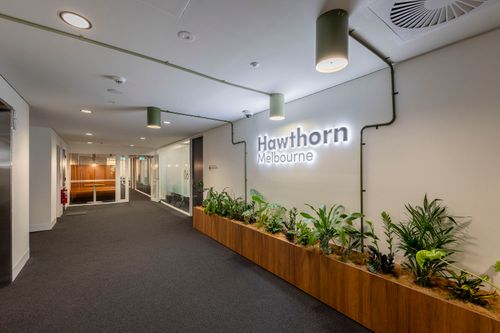 CIA Designs was responsible for crafting the aesthetic of the new campus, employing a coastal finishes colour palette inspired by the Great Ocean Road. This was juxtaposed with urban design elements to encapsulate the spirit of Melbourne. A key feature of the design was the dual arrival points from both central lift wells and a new staircase connecting the ground floor, anchored by an oval seating booth with integrated greenery and a parallel oval feature pendant light.